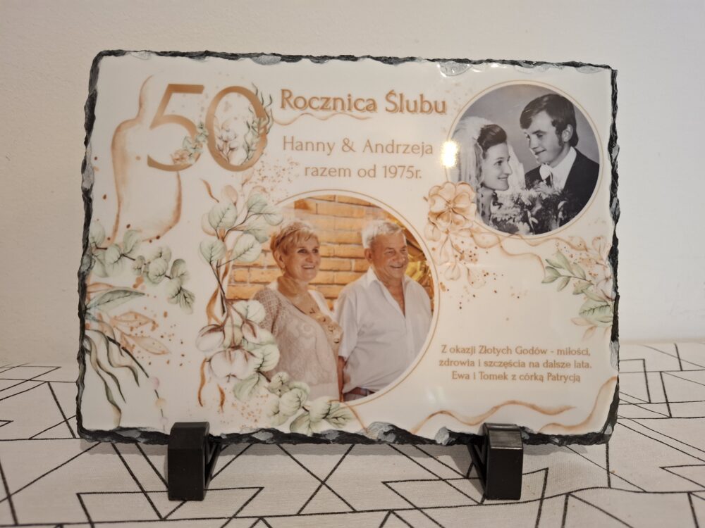 Foto Granit - Elegancki prezent na 50-tą rocznicę ślubu rodzicówZłote gody to wyjątkowy czas, kiedy chcemy uczcić pół wieku miłości i oddania naszych rodziców. Foto granit jako elegancki prezent na 50 rocznicę ślubu rodziców jest wyborem, który pięknie symbolizuje trwałość ich związku. Z przestrzenią na dwa zdjęcia, możesz wybrać te, które najlepiej oddają ich wspólną podróż – od dnia ślubu po obecne chwile. Elegancki prezent na 50 rocznicę ślubu rodziców zawiera również miejsce na imiona i datę ślubu, co dodaje osobistego akcentu do tego wyjątkowego upominku. Taki foto granit to nie tylko prezent, ale też elegancka pamiątka, która będzie dumnie prezentować się w domu rodziców, codziennie przypominając im o wspólnej miłości.Każdy elegancki prezent na 50 rocznicę ślubu rodziców wykonany z foto granitu jest trwały i pięknie wykończony, gwarantując, że będzie to wartościowa i ceniona pamiątka na kolejne lata. Dając rodzicom foto granit jako elegancki prezent na 50 rocznicę ślubu, pokazujesz im, jak bardzo doceniasz i szanujesz ich miłość, która przetrwała próbę czasu.