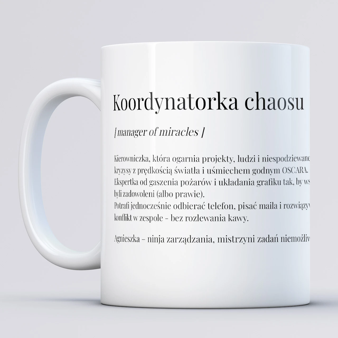 Zorganizowana, konkretna i zawsze o krok przed resztą – kubek dla kierowniczki z nadrukiem „Koordynatorka chaosu” to strzał w dziesiątkę. Idealny prezent dla kierowniczki, która z gracją ogarnia codzienny firmowy chaos i wprowadza porządek tam, gdzie inni widzą zamieszanie. Tekst w stylu zabawnej definicji idealnie pasuje do kobiety, która potrafi przewidzieć deadline’y szybciej niż Excel. Świetny wybór na prezent na Dzień Kobiet, imieniny, urodziny lub pożegnanie w pracy. Ten kubek nie tylko bawi, ale i docenia rolę liderki.