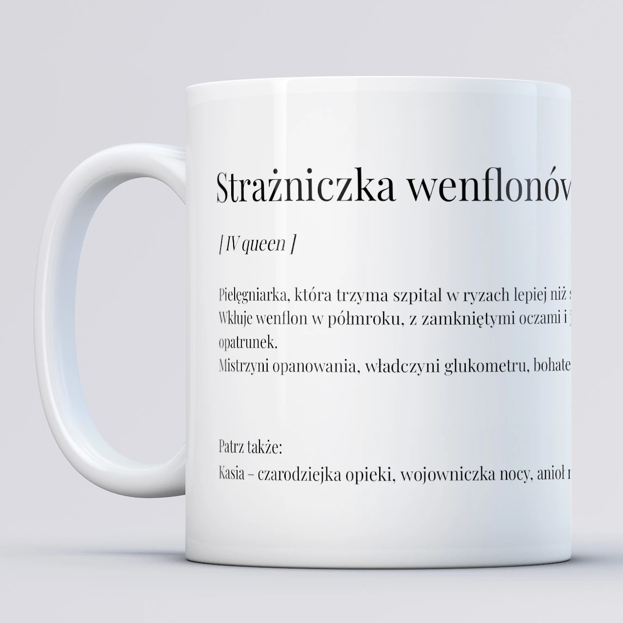 Szukasz pomysłu na prezent dla pielęgniarki, który wywoła uśmiech po ciężkim dyżurze? Ten kubek to idealne połączenie humoru i uznania dla jednej z najważniejszych profesji. Zabawny nadruk „Strażniczka wenflonów” to ukłon w stronę wszystkich pielęgniarek, które każdego dnia z oddaniem dbają o pacjentów.