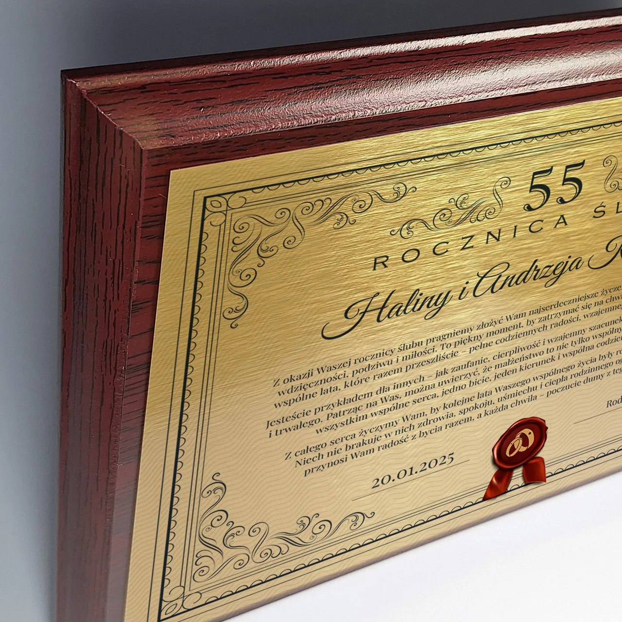 Solidny podkład wykonano z trwałej płyty MDF w głębokim odcieniu ciemnej wiśni. Subtelne, dekoracyjne profilowanie krawędzi dodaje estetyki, a powierzchnia wzbogacona o srebrną aluminiową blachę z wysokiej jakości nadrukiem zapewnia ponadczasowy wygląd. Struktura imitująca naturalne drewno sprawia, że tabliczka pamiątkowa z okazji 55-lecia ślubu prezentuje się elegancko, idealnie komponując się z wnętrzem każdego domu.