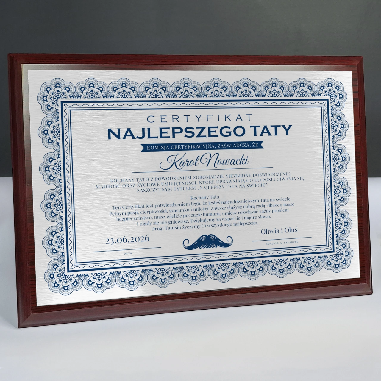 Każdy Certyfikat wykonany jest z dbałością o szczegóły – ozdobny, drewniany podkład nadaje całości prestiżowego wyglądu, a nadrukowane życzenia i tekst certyfikatu podkreślają wyjątkowość okazji. To doskonały sposób, by podziękować tacie za wsparcie, miłość, cierpliwość i obecność w każdej chwili życia. Certyfikat idealnie sprawdzi się jako prezent na Dzień Ojca, urodziny, imieniny lub po prostu „dla Taty bez okazji”.