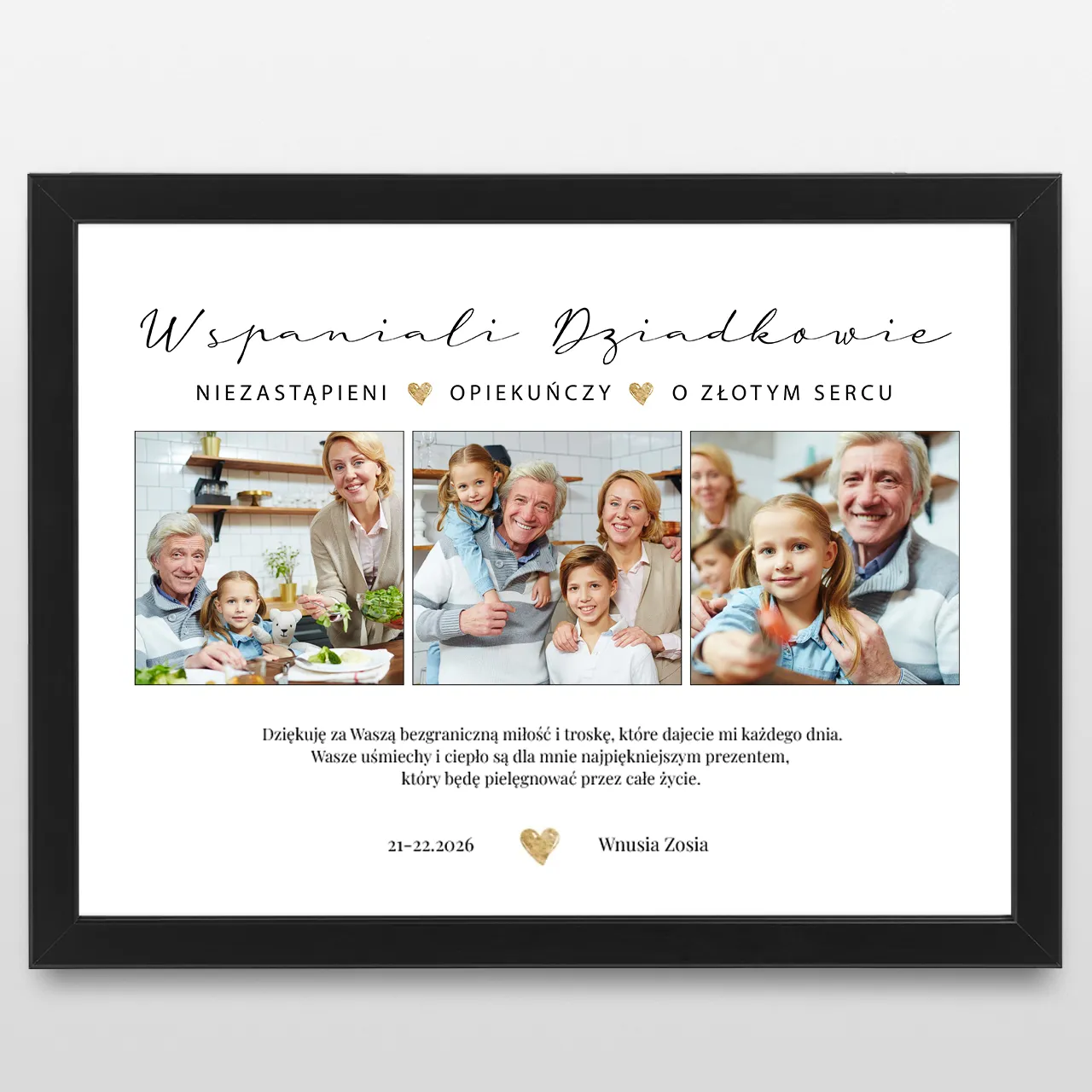 Plakat umieszczony jest w ramce o wymiarze 30x40 cm, dostępnej w kolorze czarnym lub białym, co nadaje całości uporządkowany i gotowy charakter. Wysoka jakość druku pozwala zachować wyraźne detale fotografii oraz czytelność tekstu. Prezent ze zdjęciem dla dziadków w takiej formie łączy prostotę z emocjonalnym przekazem, stając się trwałym zapisem rodzinnych wspomnień i relacji, które mają szczególne znaczenie.