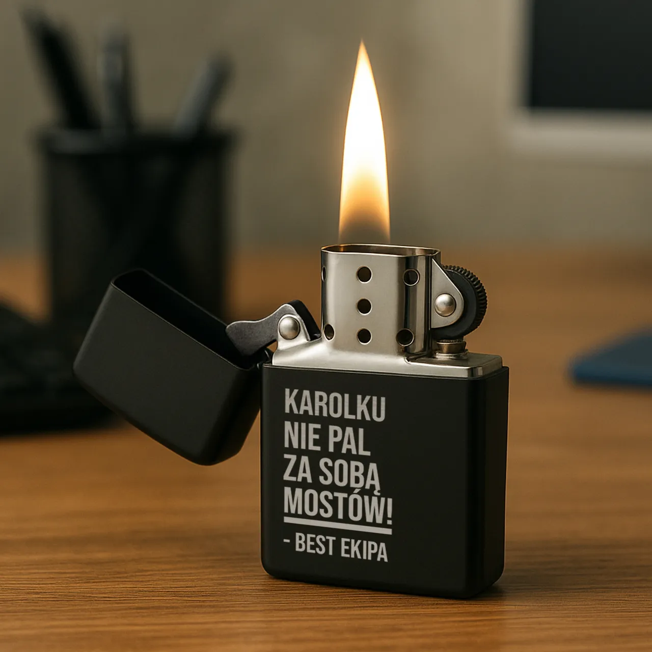 Każde pożegnanie w pracy to okazja do podarowania drobiazgu, który zostanie z kolegą z pracy na długo i będzie przypominał wspólne chwile spędzone w zespole. Zapalniczka z grawerem dla kolegi odejście z pracy to pomysł, który łączy w sobie symbolikę i praktyczne zastosowanie. W projekcie przewidziano miejsce na imię oraz podpis, co sprawia, że prezent nabiera indywidualnego charakteru. Hasło „nie pal za sobą mostów” dodaje całości nuty humoru, a jednocześnie stanowi subtelne przesłanie, które doskonale wpisuje się w okazję pożegnania. Solidne wykonanie oraz klasyczny design sprawiają, że produkt będzie długo służył w codziennym użytku, a jednocześnie stanie się pamiątką pełną znaczenia. Tego typu gadżet z pewnością wyróżni się spośród standardowych prezentów wręczanych przy zmianie pracy i pozostawi pozytywne wrażenie na osobie obdarowanej. Dzięki możliwości personalizacji całość nabiera unikatowego charakteru, a prosty gest staje się czymś, co wzmacnia więzi i przypomina o wspólnie spędzonym czasie.