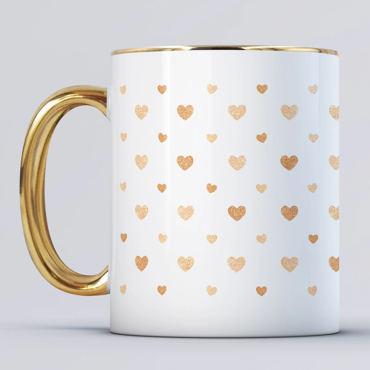 Złoty kubek na Walentynki z imieniem to wyjątkowa propozycja dla osób, które chcą podarować coś osobistego, eleganckiego i pełnego emocji. Kubek jest biały, wykończony złotym uchem oraz złotym rantem, co nadaje mu elegancki, luksusowy charakter. Całość dopełnia wzór złotych serc rozmieszczonych na całej powierzchni kubka, dzięki czemu prezent od razu kojarzy się z miłością i Walentynkami.